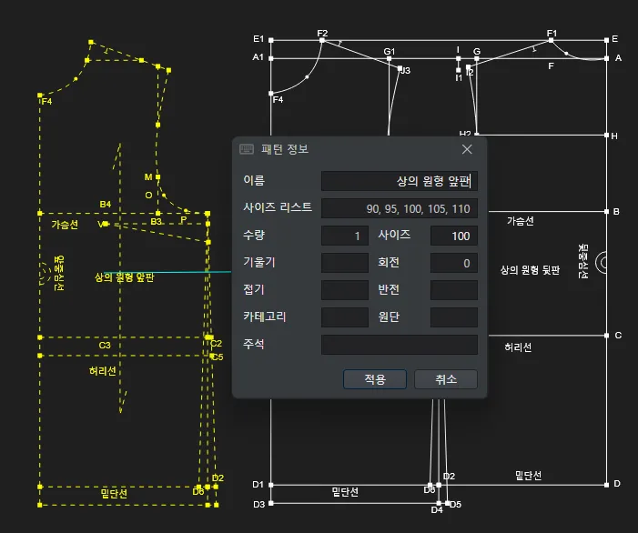 입력 창에 패턴 이름을 입력하고 적용을 클릭하면 패턴 생성이 완성됩니다.