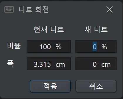 회전할 다트의 비율이나 너비를 입력하면, 입력값에 따라서 미리보기가 바뀌며, 적용을 클릭하여 다트를 회전시킵니다.