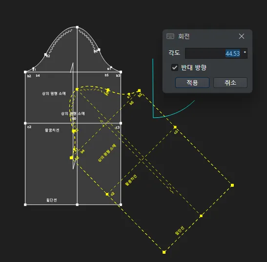‘대화창’을 켠 상태에서 회전 끝점(■)을 선택하면,