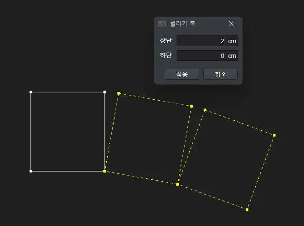 위 아래 폭 입력창이 뜨고 원하는 폭을 입력하면서 미리보기로 벌리기 형상을 확인합니다.