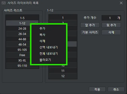 사이즈 리스트에서 마우스 우클릭하면 추가 / 복사 / 삭제 / 선택 내보내기 / 전체 내보내기 / 불러오기 를 할 수 있습니다.