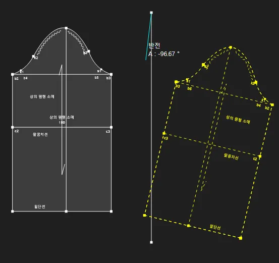 ‘대화창’을 켠 상태에서 반전 끝점(■)을 선택하면, ‘반전’ 대화상자가 나오고 원하는 각도를 입력하여 대칭축을 선택할 수 있습니다.