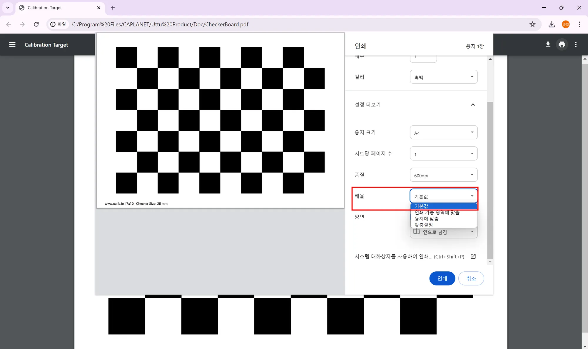 체커보드 출력 시 아래 사진과 같은 인쇄 설정을 적용해주시길 바랍니다.