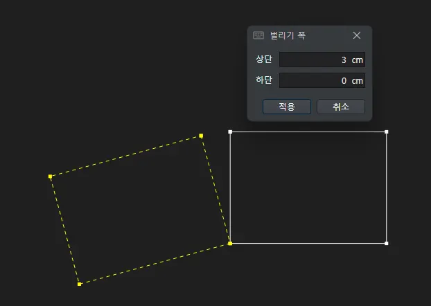 위 아래 폭 입력창이 뜨고 원하는 폭을 입력하면서 미리보기로 벌리기 형상을 확인합니다.
