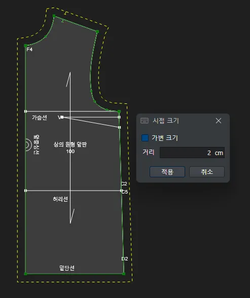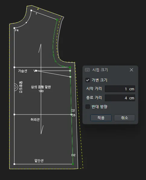 ‘가변 크기’를 체크하면 시작점과 끝점에서의 시접량을 다르게 부여할 수 있습니다.