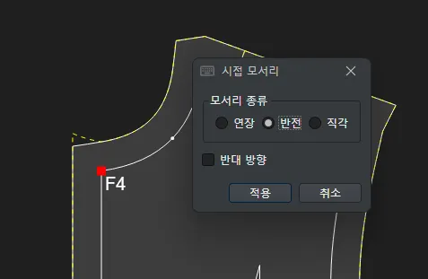 연장/반전/직각 중 하나를 선택하면 미리보기로 확인 가능하고, 코너의 모양을 반대방향으로 바꿀 수도 있습니다.