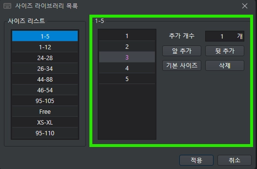 [적용] 버튼을 누르면 현재 보고 있는 사이즈 체계로 변경되고, 모든 패턴은 기본 사이즈로 설정됩니다.