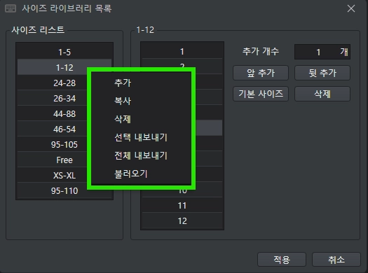 사이즈 리스트에서 마우스 우클릭하면 추가 / 복사 / 삭제 / 선택 내보내기 / 전체 내보내기 / 불러오기 를 할 수 있습니다.