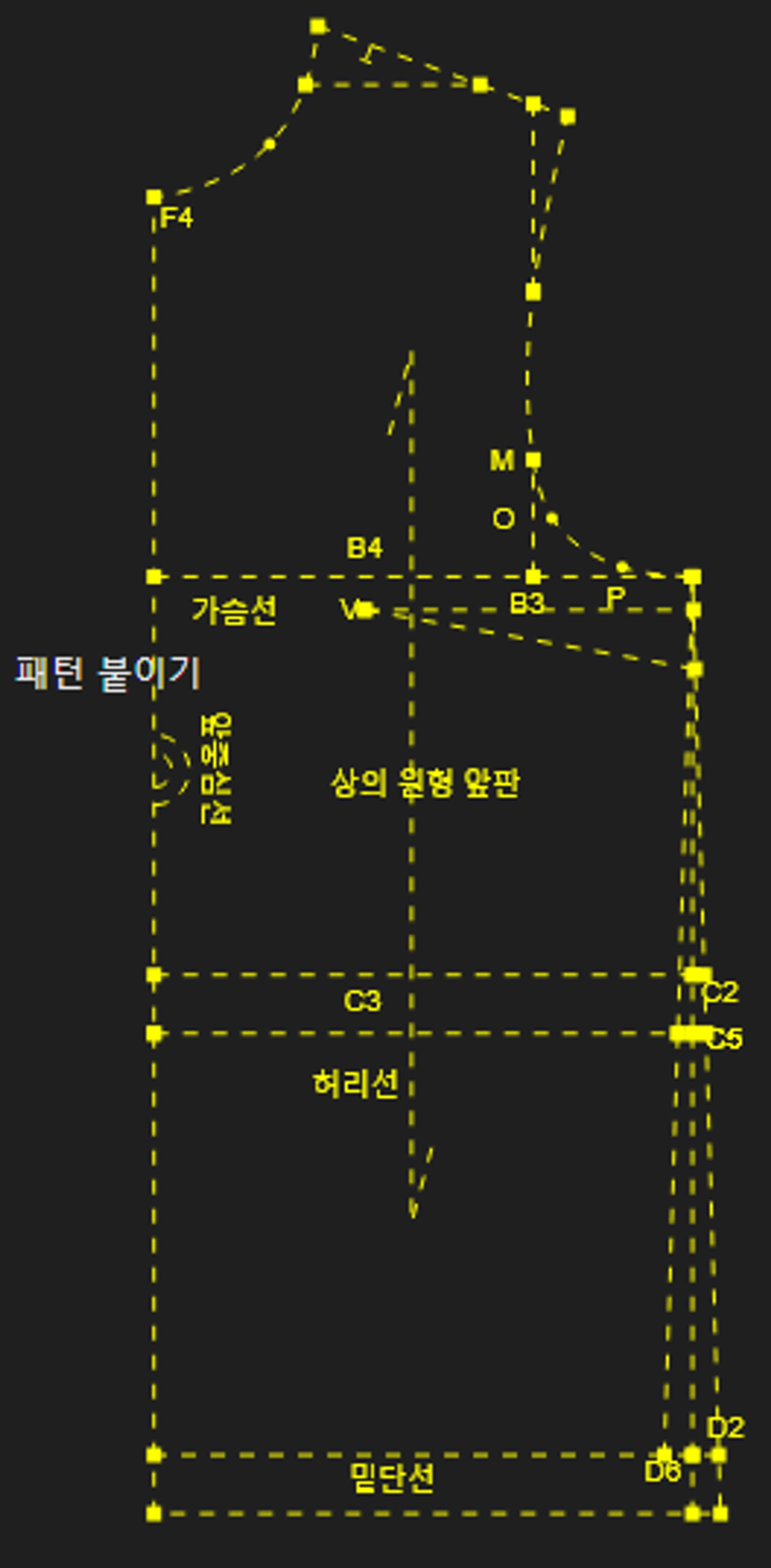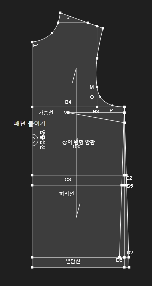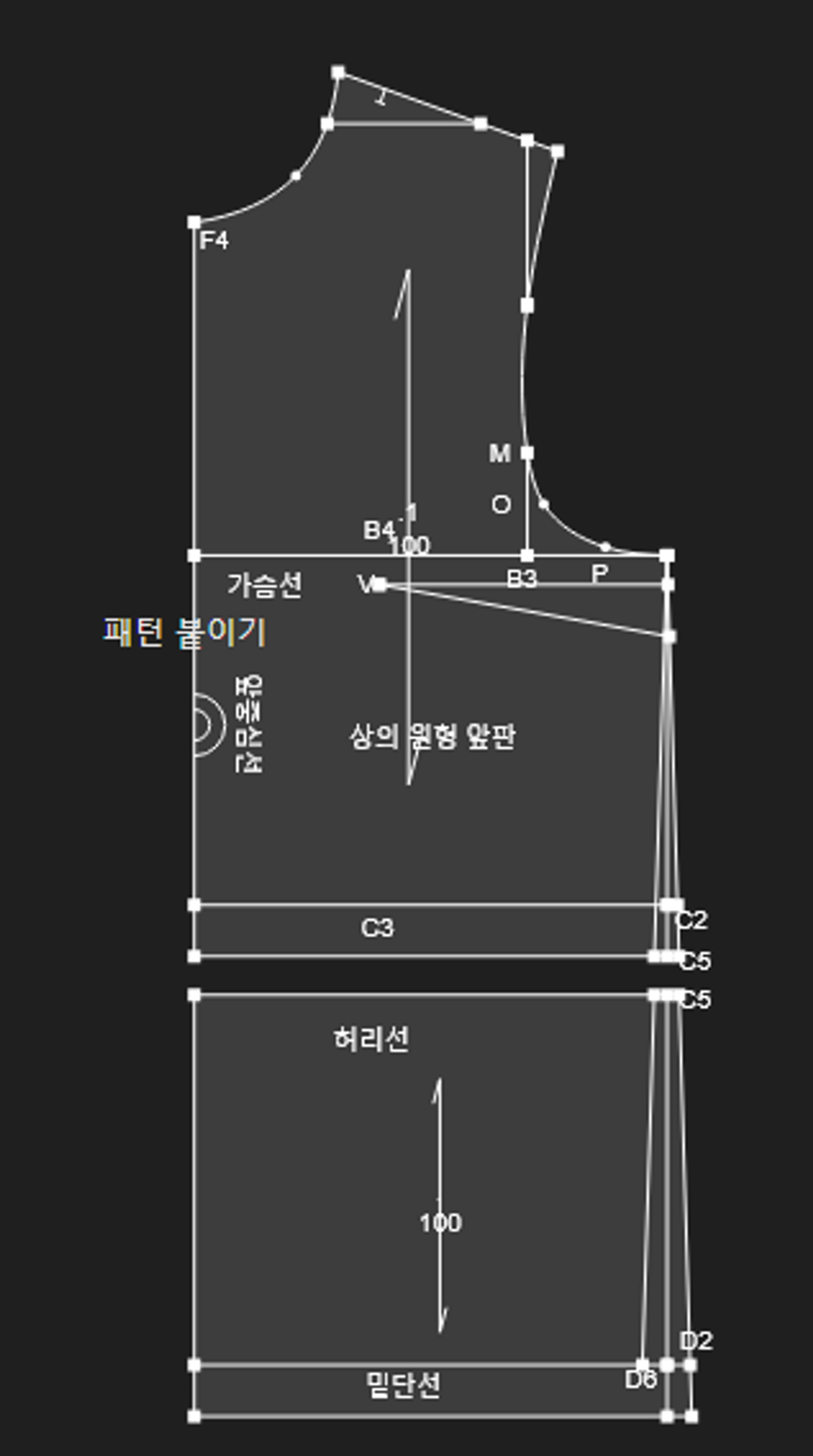 기준선이 있는 패턴의 식서 방향으로 패턴이 합쳐지고, 붙인 패턴의 그레이딩 값 및 너치 등이 유지됩니다.
