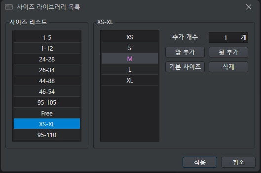 사이즈 리스트에서 마우스 우클릭하면 추가 / 복사 / 삭제 / 선택 내보내기 / 전체 내보내기 / 불러오기 를 할 수 있습니다.