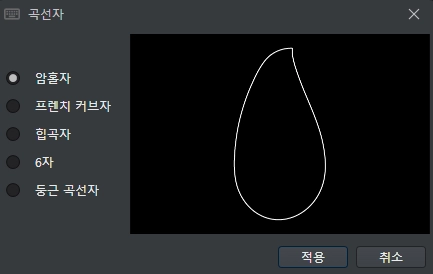 마우스 우클릭을 하면 미리보기 부분의 곡선이 도장처럼 찍히며 곡선자의 처음으로 돌아옵니다.