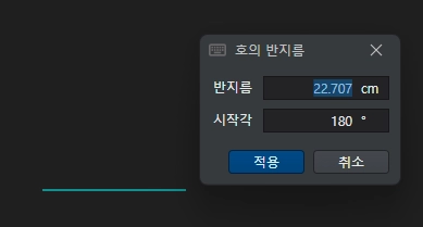 ‘대화창’을 켠 상태에서 원호의 시작점을 선택하면, ‘호의 반지름’ 대화상자가 나옵니다.
