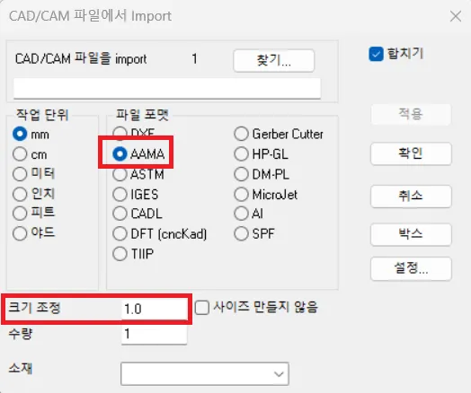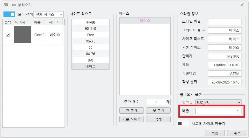 Optitex → 파일/데이터전환/CAD CAM파일로 Import(AAMA, 크기조정 1)