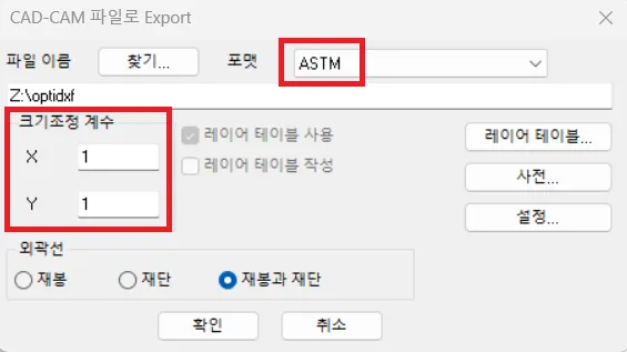 Optitex → 파일/데이터전환/CAD CAM파일로 Export(ASTM, 크기조정계수 1)