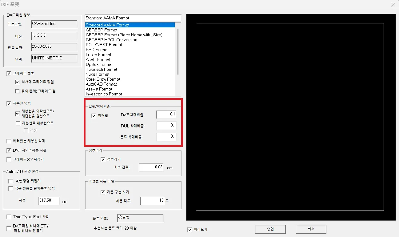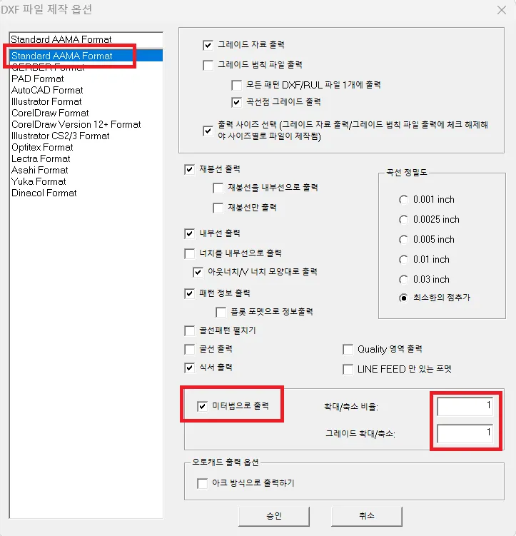 STYLE CAD → 파일/DXF파일제작 - 제작옵션(AAMA / 미터법으로 출력, 비율 1)