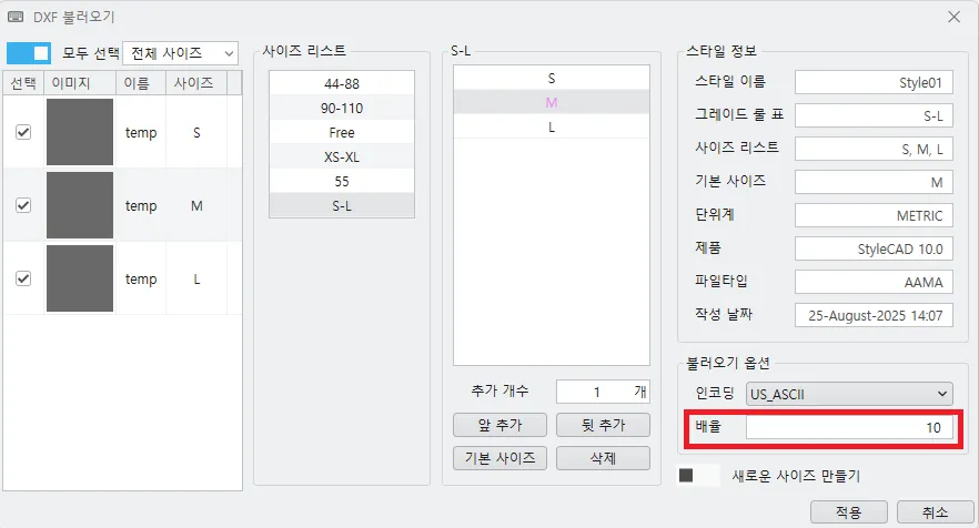 STYLE CAD → 파일/파일입력/DXF 파일 입력(단위/확대비율 0.1)