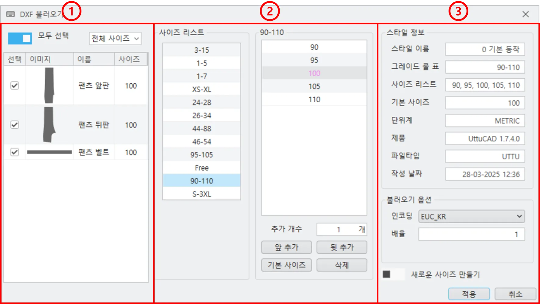 예를 들어 현재 작업 중인 파일의 사이즈 체계가 S-M-L이고, 불러오는 DXF의 사이즈 체계가 30-35-40-45-50 이면 불러오는 DXF 파일의 사이즈 체계가 S-M-L로 바뀌게 됩니다.