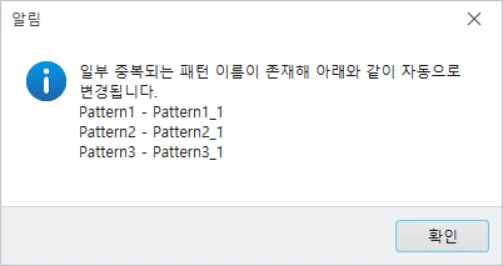 확인을 누르시면 패턴이름_1로 패턴 이름 중복을 피해서 지정됩니다.