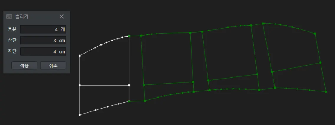 등분 개수와 위 아래 폭 입력창이 뜨고 입력하면서 미리보기로 등분 벌리기 형상을 확인합니다.