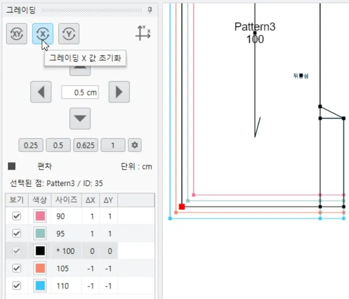 그레이딩 점(들)을 선택하여 그레이딩 X값 초기화 아이콘을 클릭하면 X 편차값이 “0”이 됩니다.