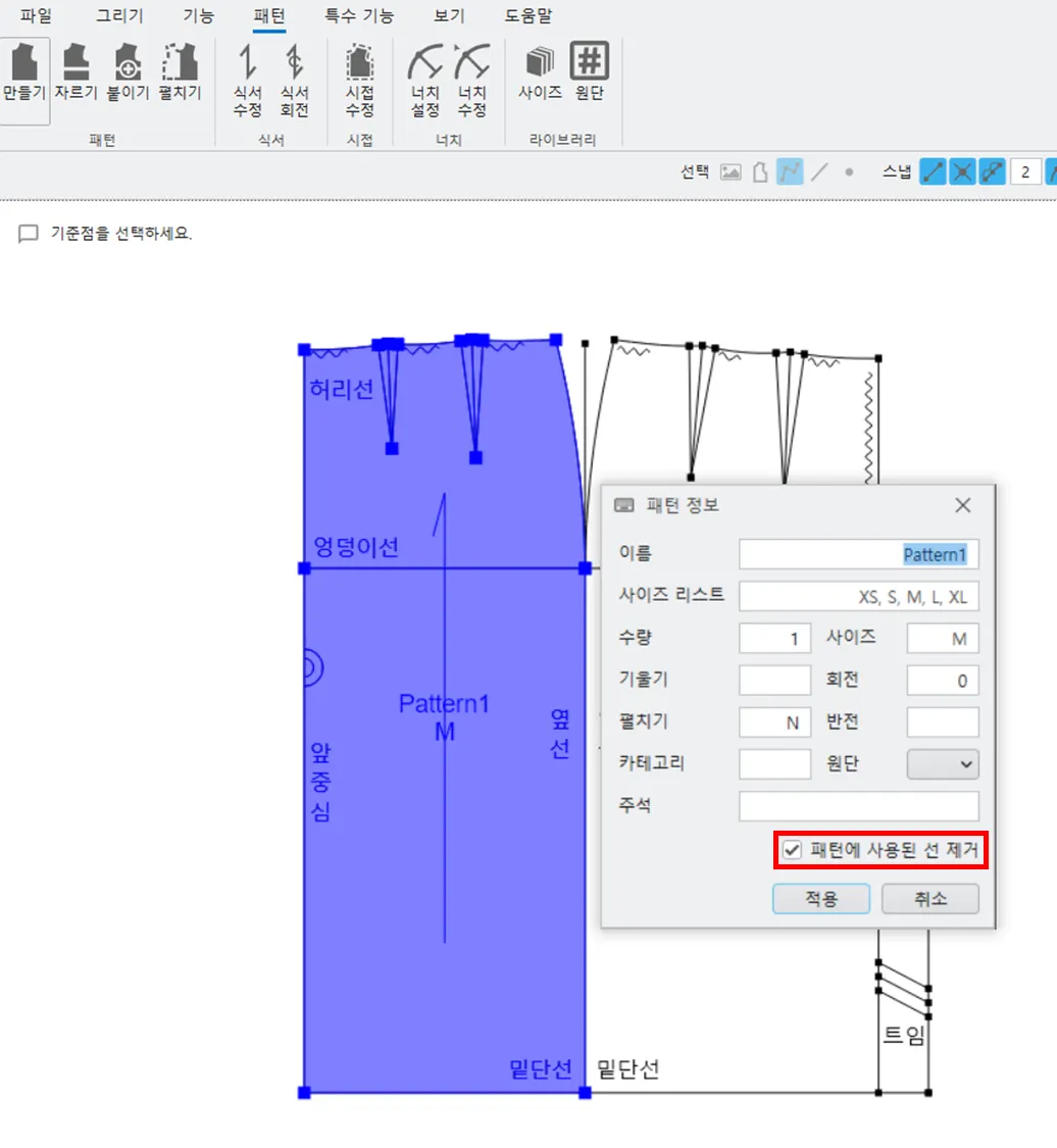 패턴 정보 창 하단부의 “패턴에 사용된 선 제거” 항목을 체크 해제하고 적용을 클릭합니다.