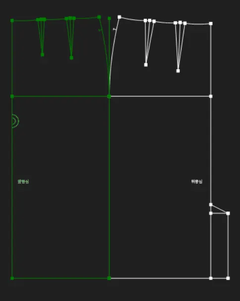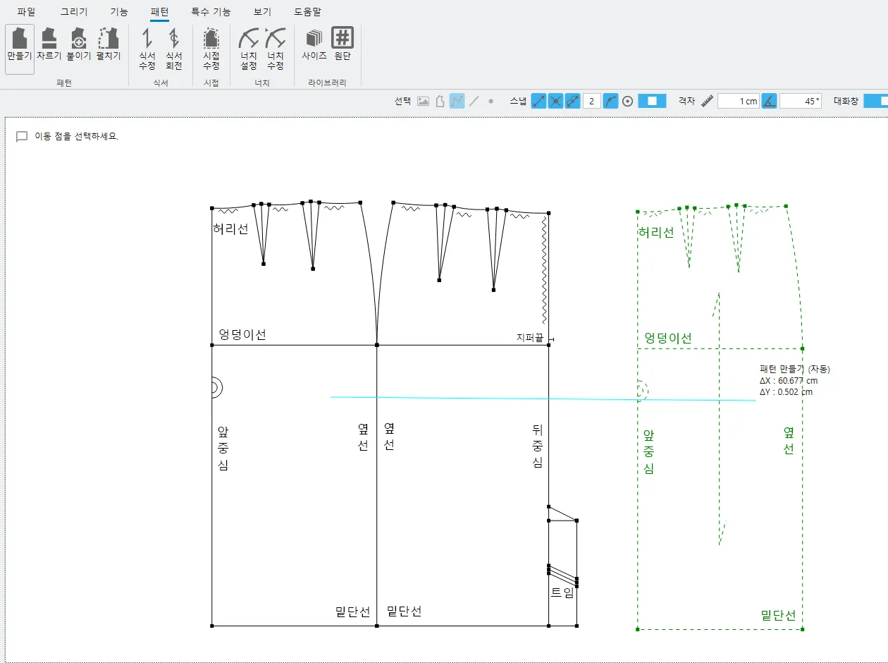 이동 시작점을 클릭하면 완성패턴은 회색으로 바뀌며, 식서표시가 자동으로 생성됩니다.