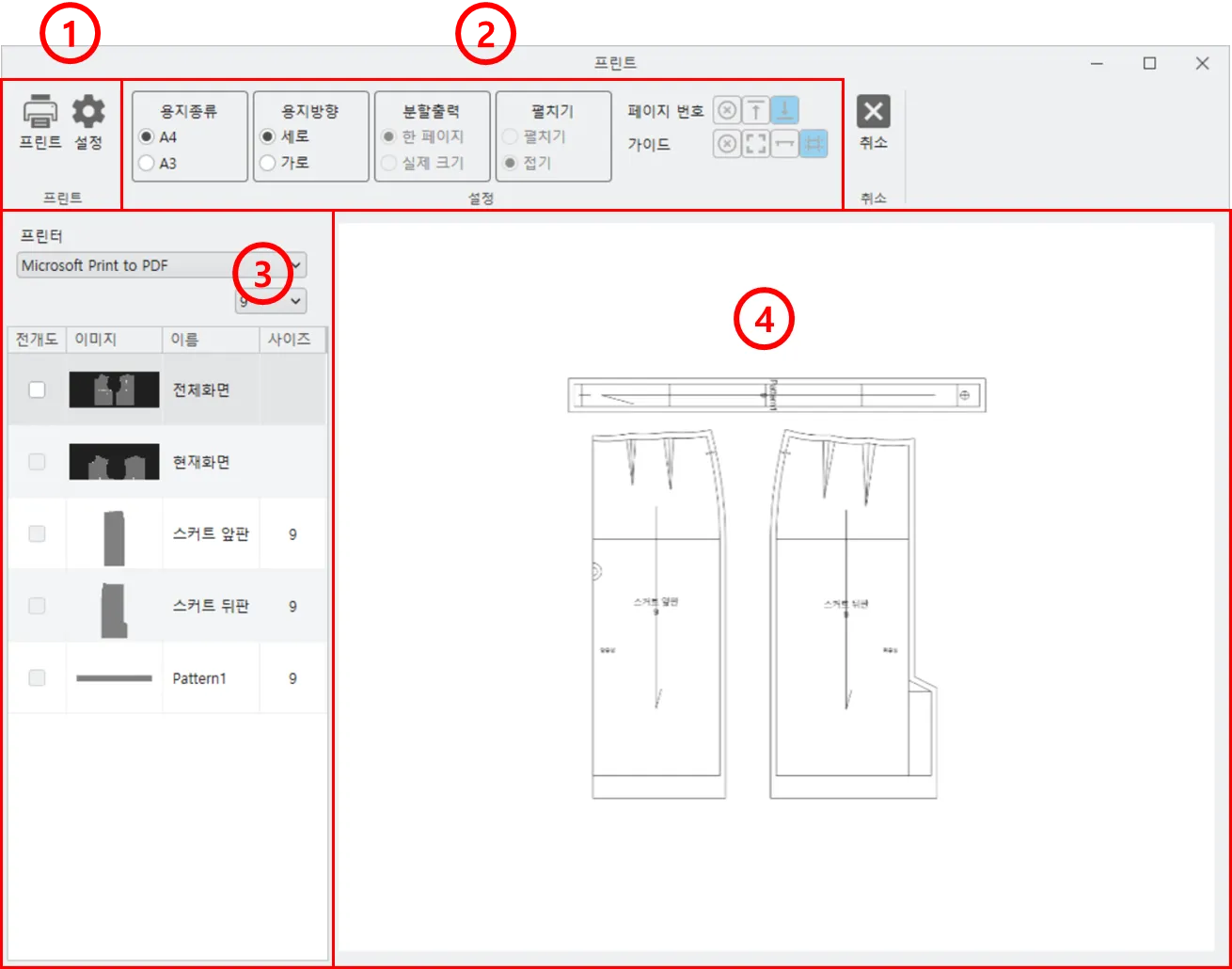 프린트를 실행하면 아래 그림과 같은 창이 뜹니다. 프린트는 패턴과 그리기 개체도 출력할 수 있습니다.
