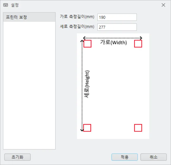 프린터마다 오차가 다르므로 보정하여 사용 후 반드시 초기화 버튼을 클릭하여 원래 상태로 돌려 놓아야 이후 작업에 영향을 주지 않습니다.