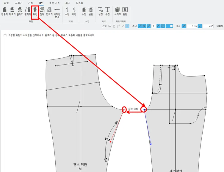 이동할 패턴(앞판)의 점을 선택한 후 우클릭하고, 고정할 패턴(뒤판)의 점을 선택한 후 우클릭하면 이동할 패턴이 선택한 점으로 이동합니다. 여기서 점을 선택하실 때 방향을 잘 확인하시고 선택하셔야 합니다.