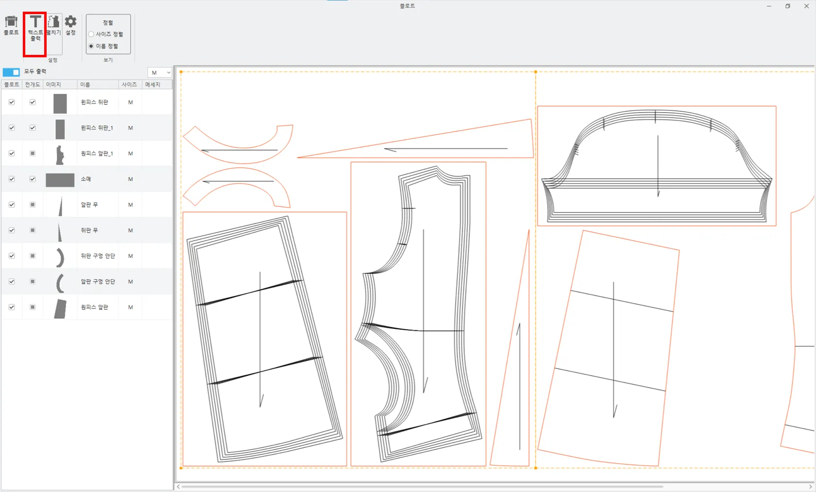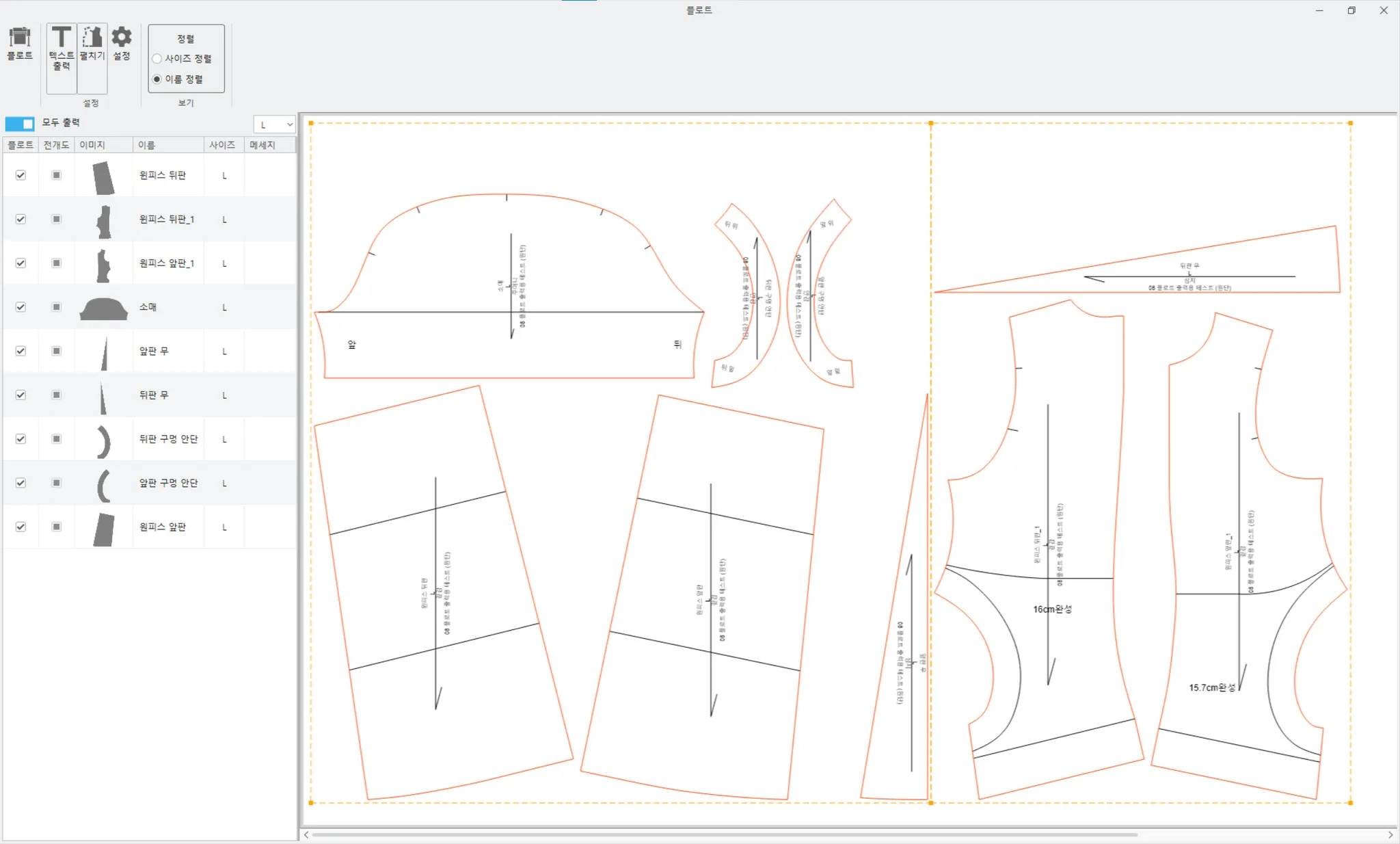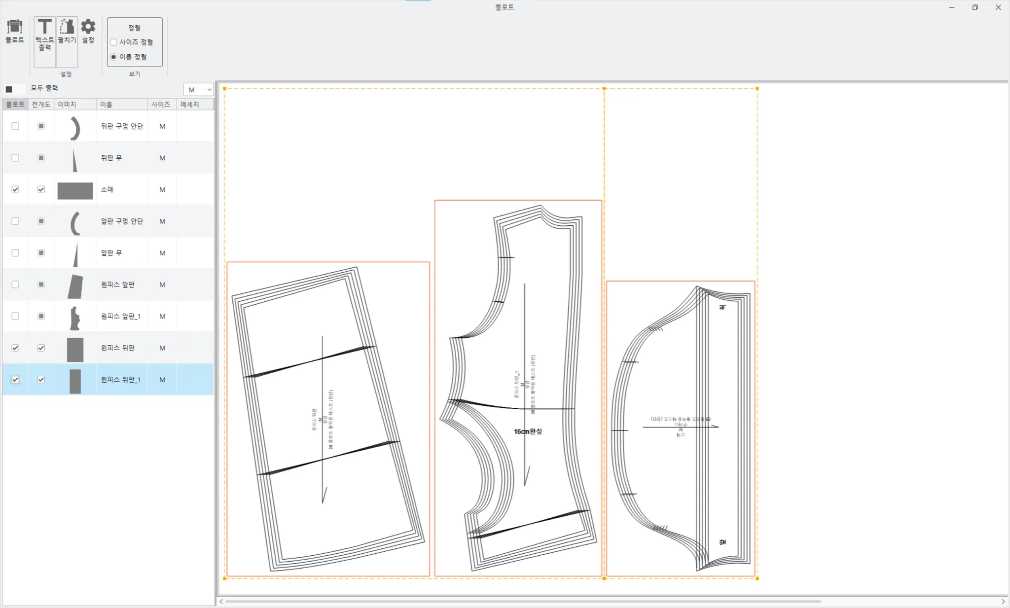 왼쪽의 패턴 정보창에서 원하는 패턴만 선택하면 플로터 용지 크기에 맞게 자동 배치합니다.
