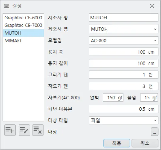 자르기 (MUTOH 모델만 적용) : 칼압과 해제압 설정