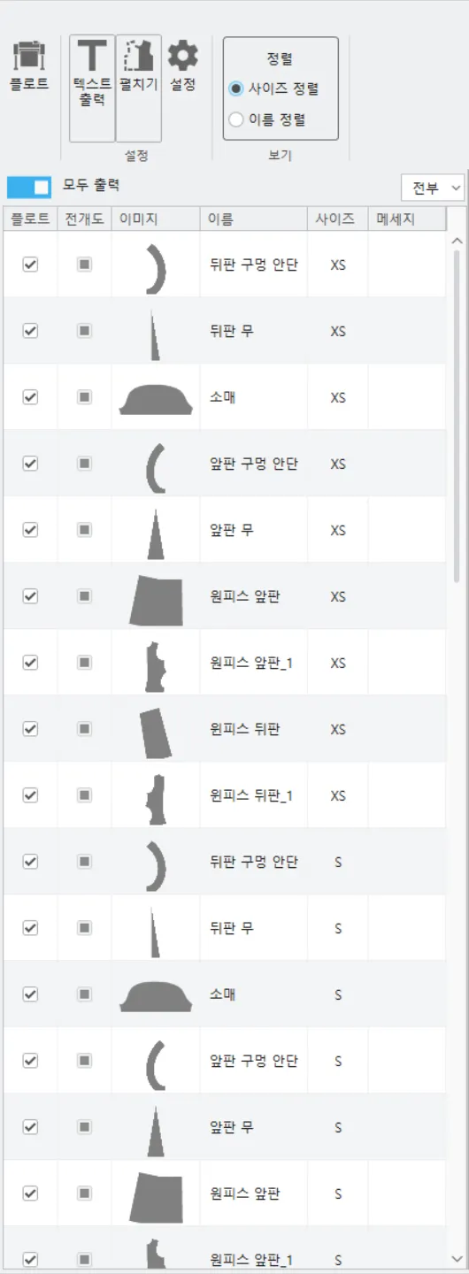 → 아래 그림과 같이 전개도를 체크하면 그레이딩된 패턴들이 나타나고 플로트할 수 있습니다.
