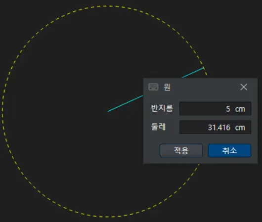 원하는 반지름이나 둘레 길이 입력값에 따라서 미리보기가 바뀌며, 적용을 클릭하여 원을 그립니다.