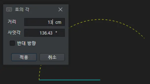 미리보기가 바뀌며, 반대 방향을 클릭하면 방향이 바뀝니다. 적용을 클릭하여 호를 그립니다.