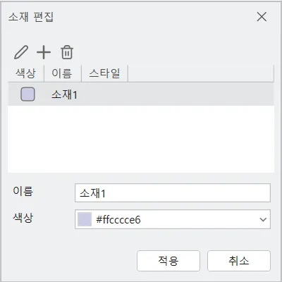 편집 / 추가 / 삭제 아이콘을 이용하여 소재를 편집 / 추가 / 삭제할 수 있습니다.