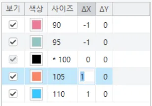 사이즈 별 불규칙 편차를 줄 때는 편차값이 달라지는 사이즈를 표에서 클릭한 후, 편차값을 적용합니다.