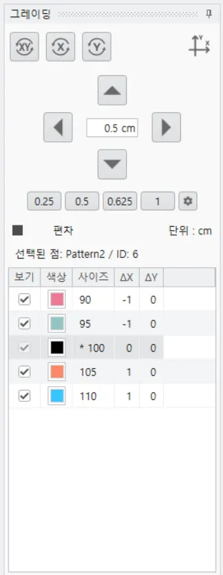 패턴만 그레이딩을 할 수 있으며, 그레이딩 창에서는 그레이딩 포인트만 보이고 선택할 수 있습니다.