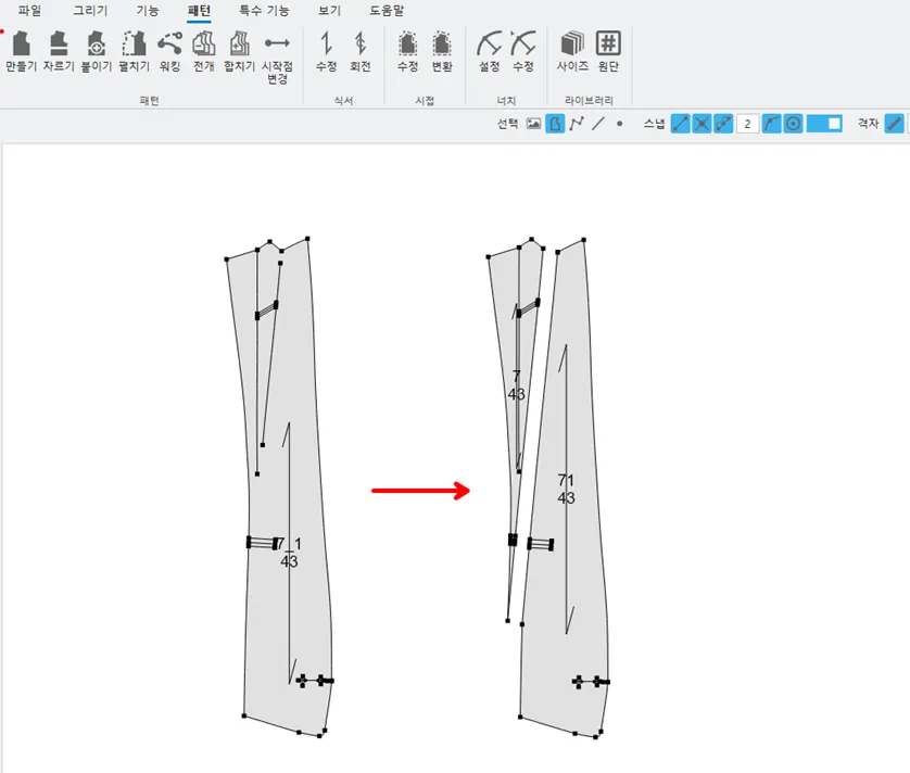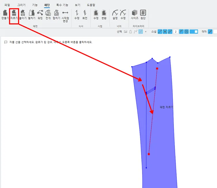 선택한 선은 빨간색으로 바뀌고, 마우스 오른쪽 클릭하면 패턴을 두 개로 자를 수 있습니다.