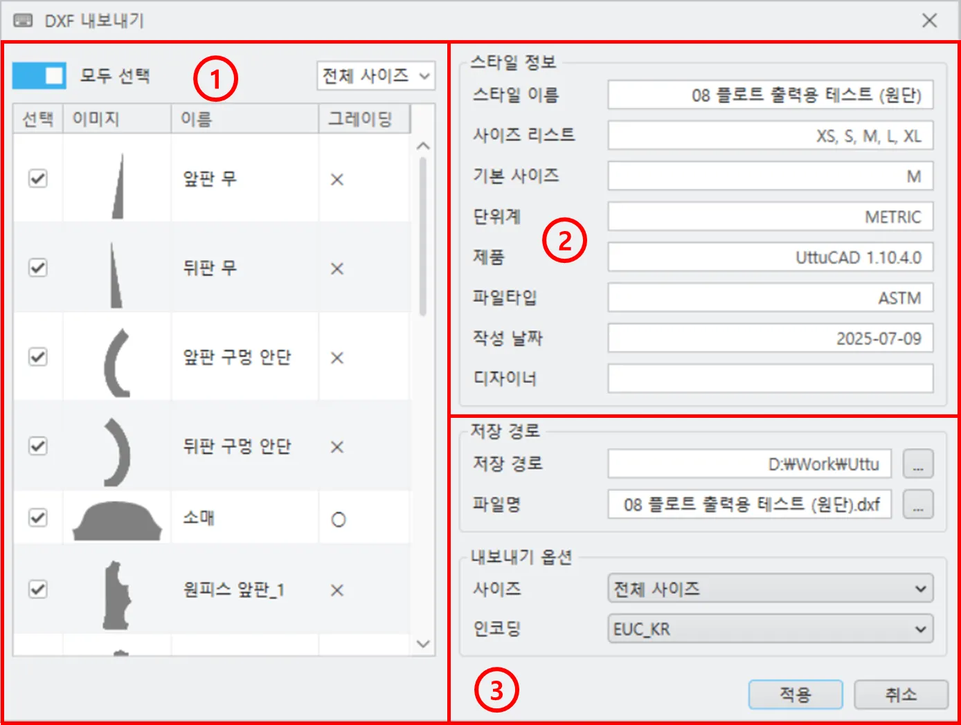 패턴을 전체 또는 사이즈 별로 선택해서 내보낼 수 있습니다.