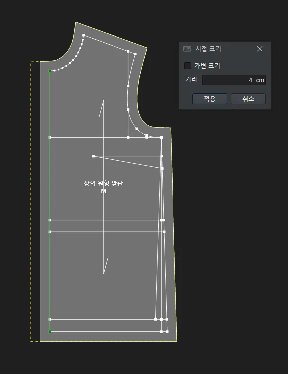 생성한 시접에 대응하는 외부선들을 선택하고 마우스 우클릭을 하면 시접 크기 입력창이 뜨고 크기를 입력하면 수정됩니다.