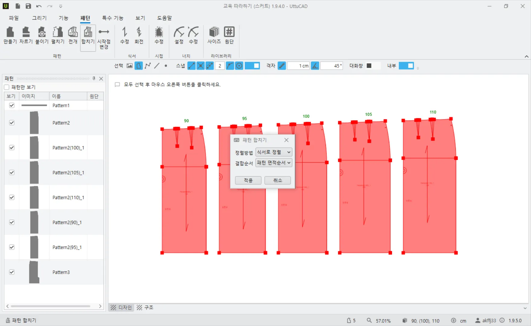 우클릭을 하면 패턴 위에 사이즈가 표시되고 패턴 합치기 팝업 창이 뜹니다.