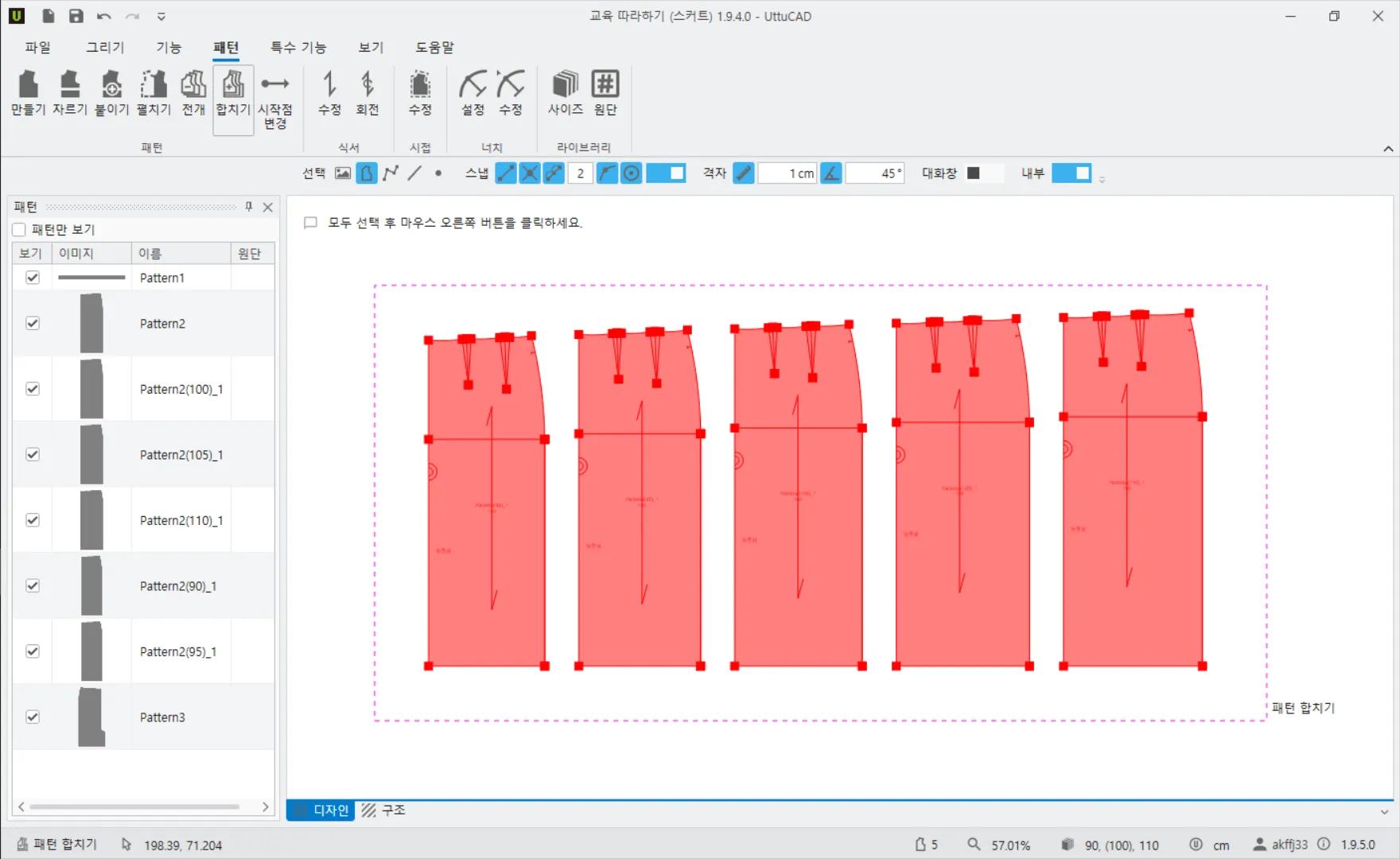 합치기 기능은 그레이딩된 패턴을 전개한 패턴들을 합치거나