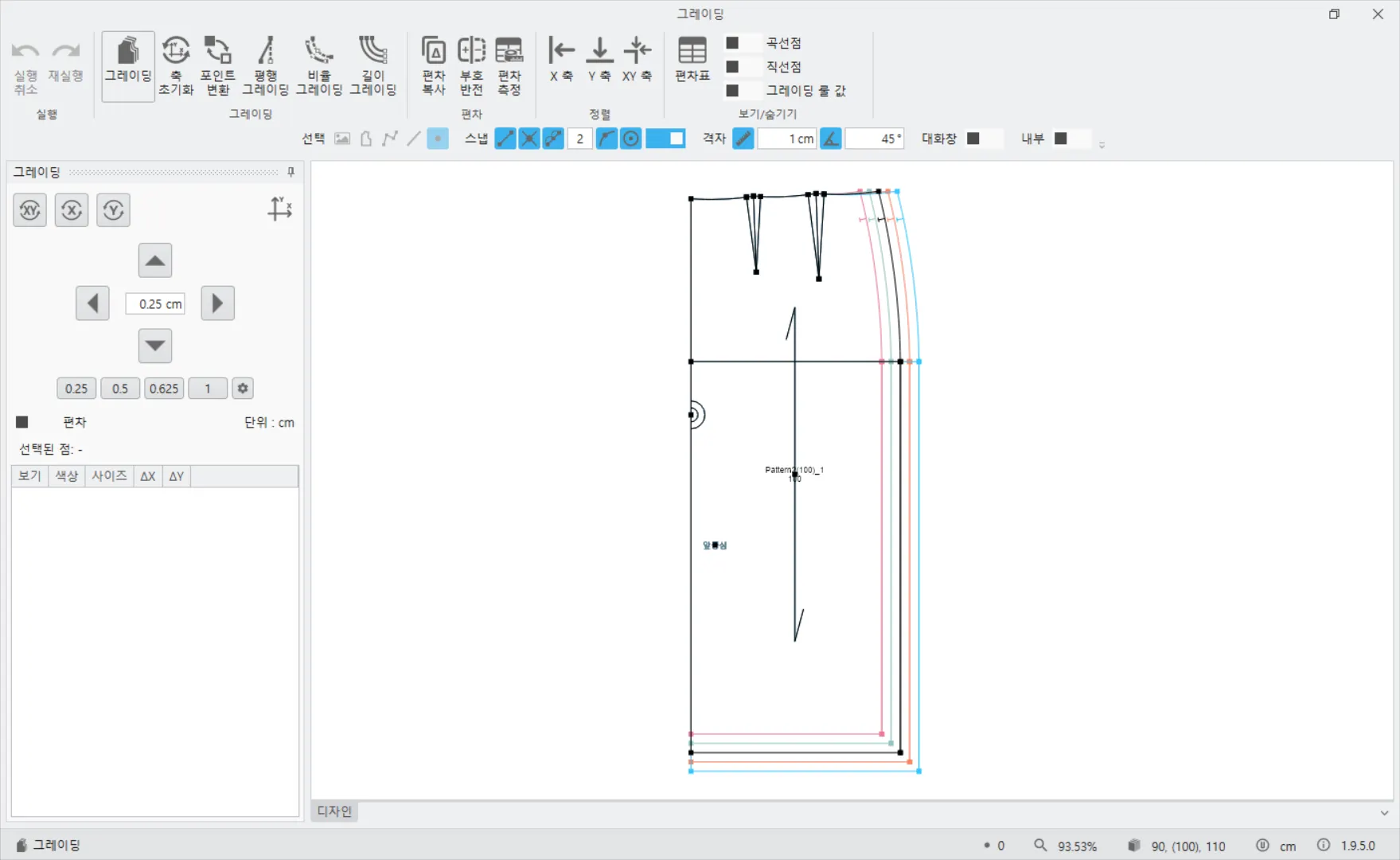 합치기를 완료하면 기준 사이즈만 나타나고 그레이딩 모드로 들어가야 합쳐진 패턴들을 확인할 수 있습니다.