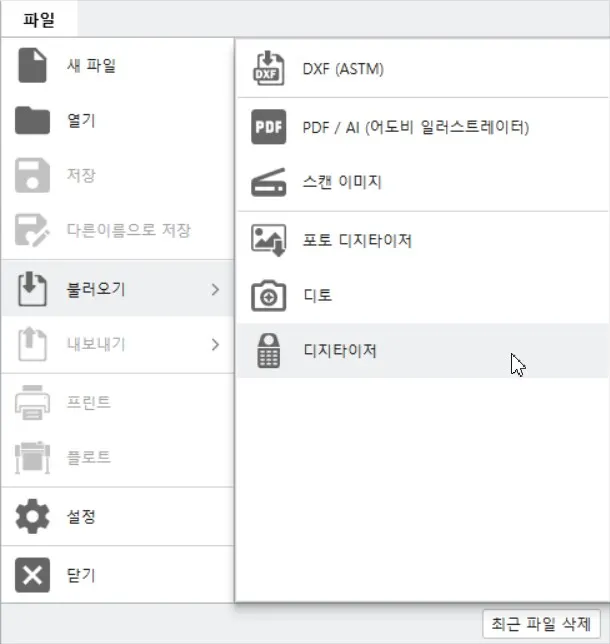 파일 - 불러오기 - 디지타이저 메뉴를 선택하면 아래와 같은 디지타이저 창이 뜹니다.