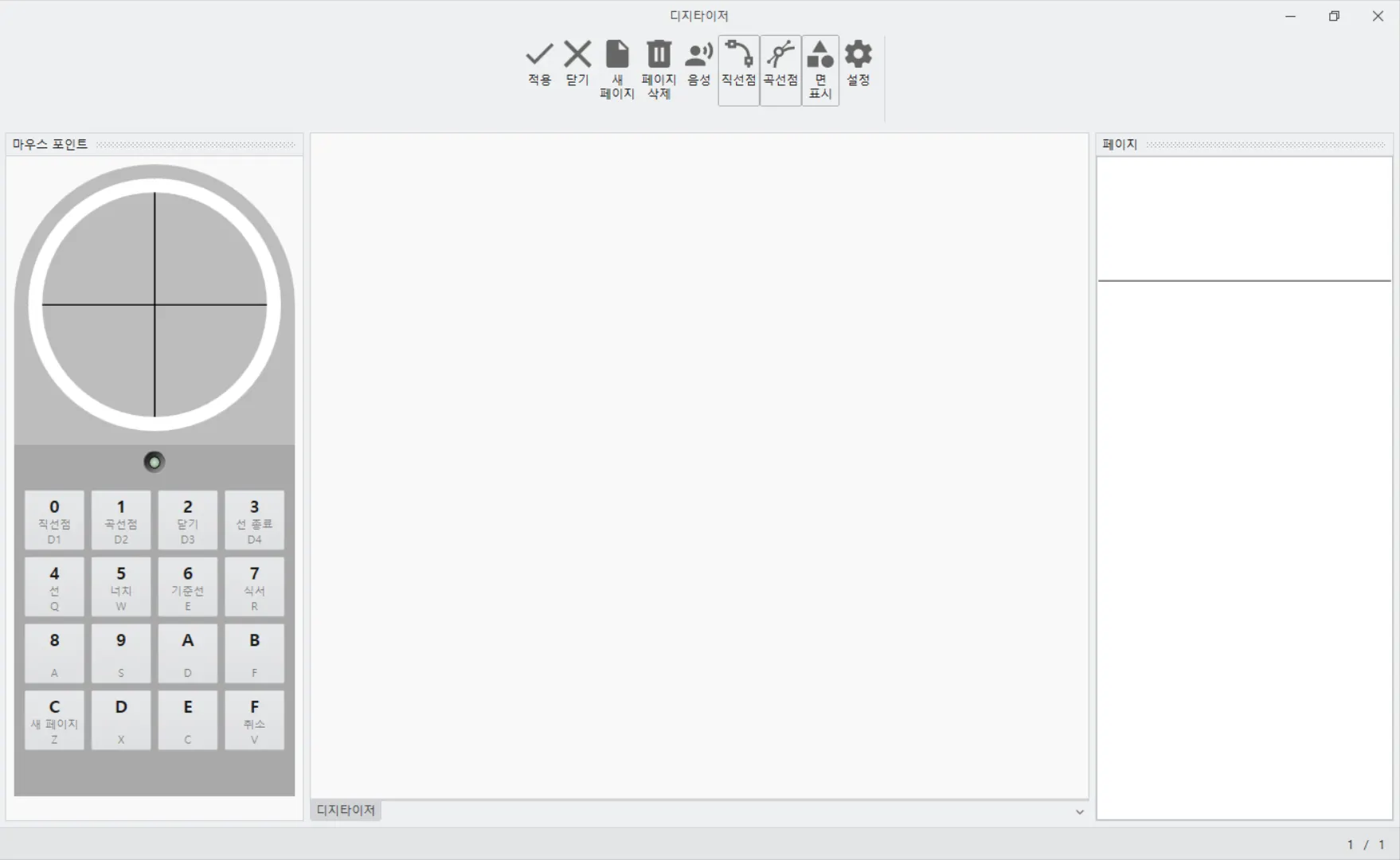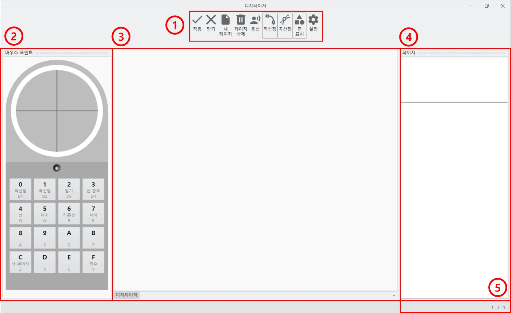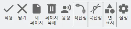 ① 구성모음 : 적용 / 닫기 / 새 페이지 / 페이지 삭제 / 음성 / 직선점 / 곡선점 / 면 표시 / 설정으로 구성