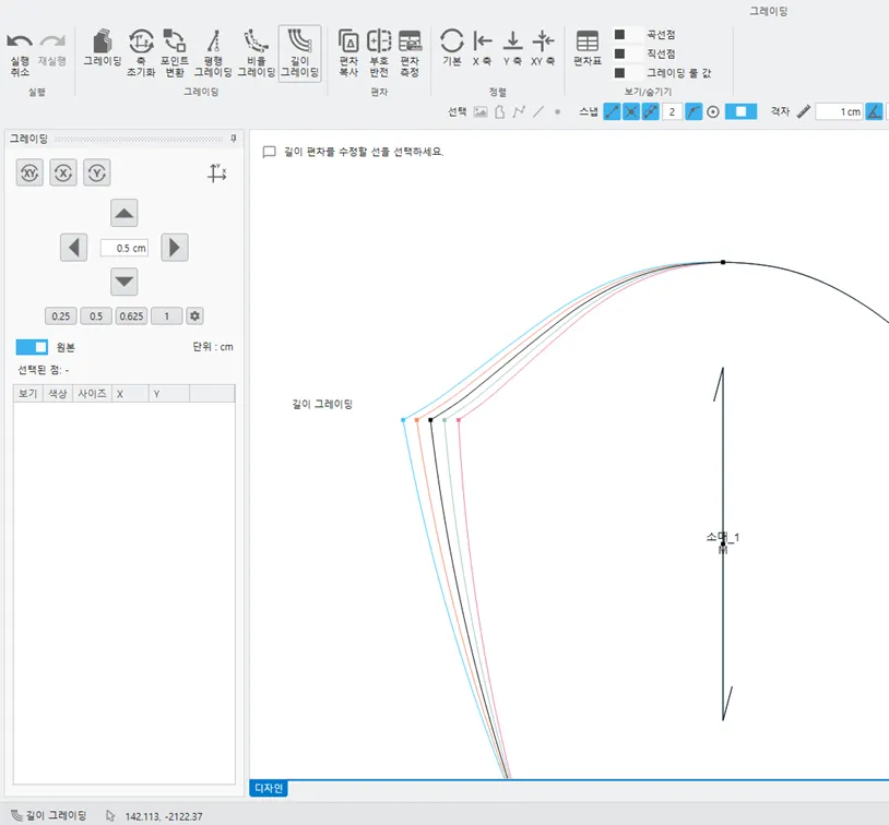 ① 길이 그레이딩은 선의 길이 편차를 맞춰주는 기능으로 길이 그레이딩 클릭-해당 선분 클릭