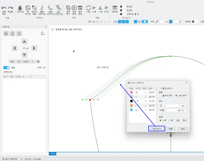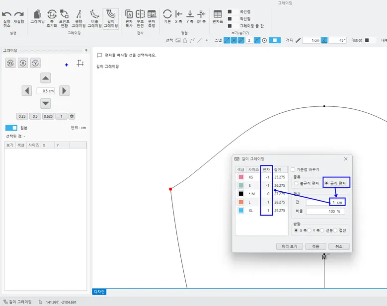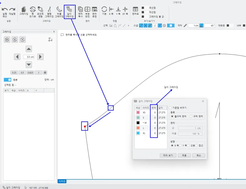 길이 편차값을 수동으로 입력하거나 기존의 길이 편차값을 복사하여 선의 길이 편차값으로 그레이딩하는 기능