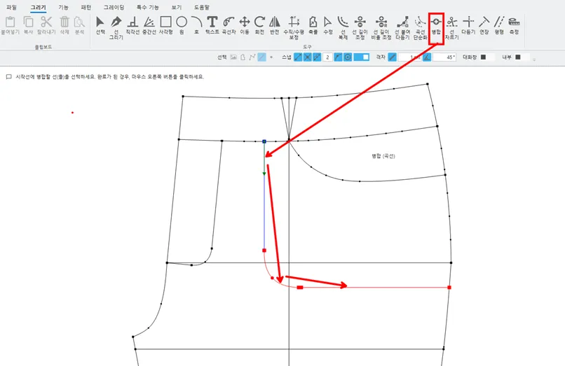 병합할 시작선 선택 시 병합할 선이 있는 방향을 고려하여 선택하고 우클릭하면 화살표가 나타납니다.