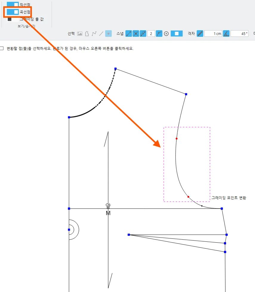 상단에 곡선점 보기를 켜야 선택됩니다.
