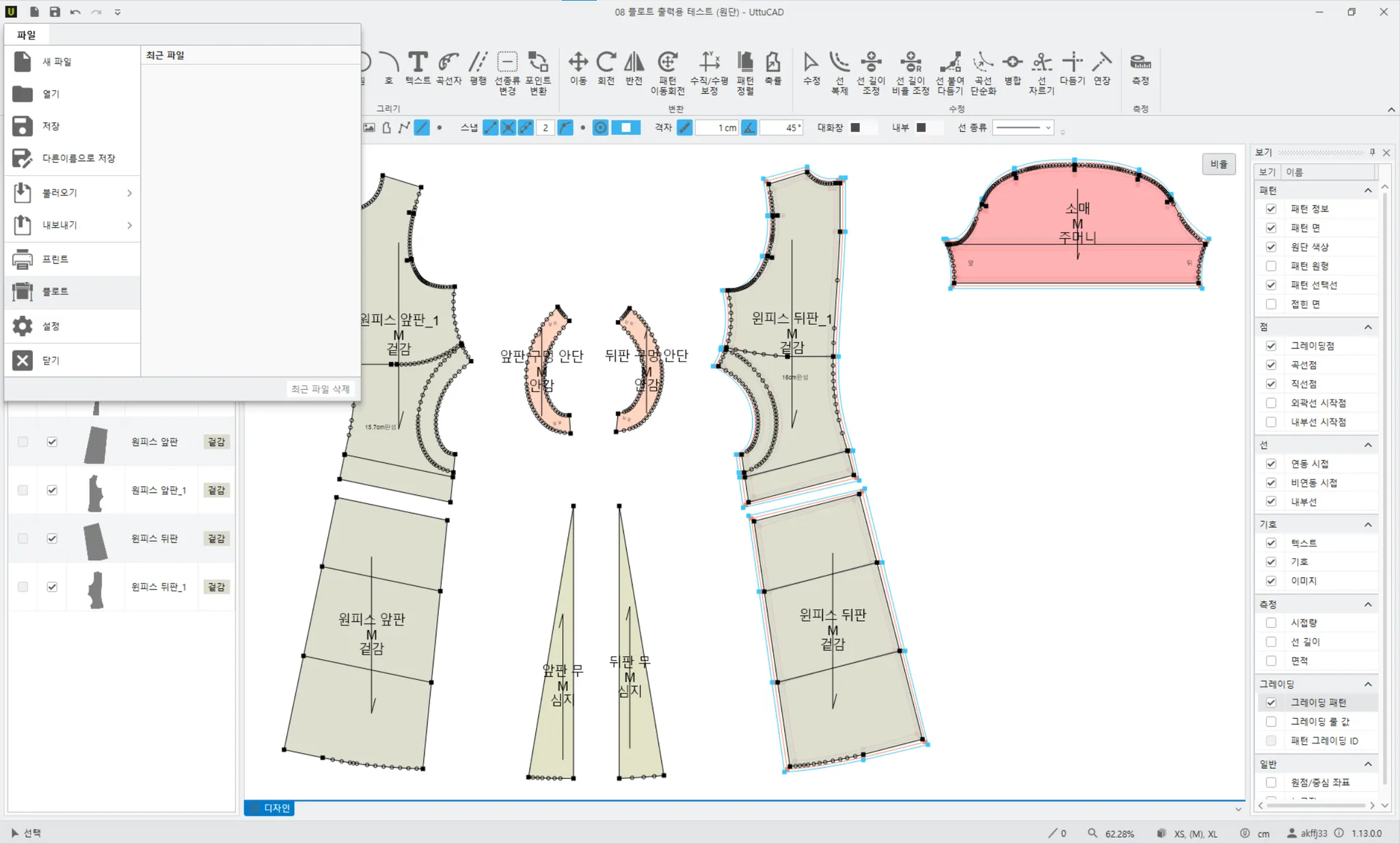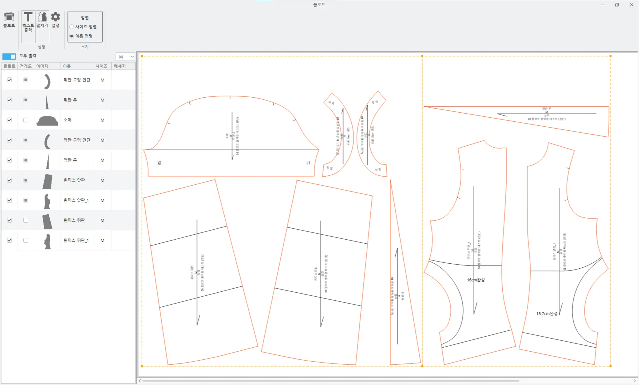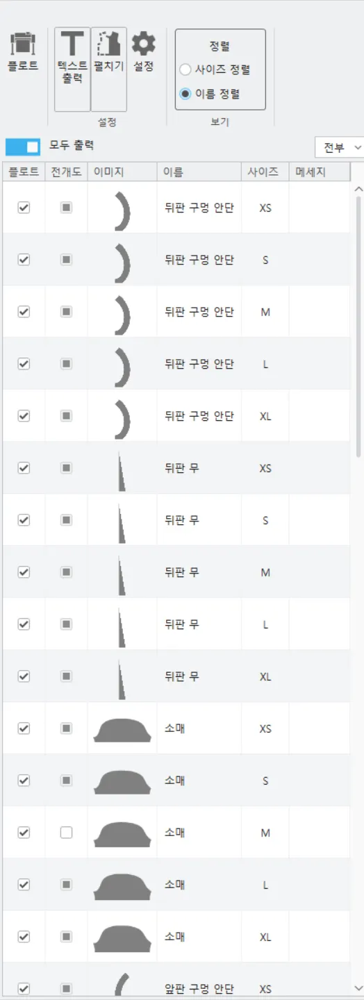 → 아래 그림과 같이 전개도를 체크하면 그레이딩된 패턴들이 나타나고 플로트할 수 있습니다.